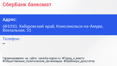 СберБанк, банкомат по адресу 681010, Хабаровский край, Комсомольск-на-Амуре, Вокзальная, 51 в дальнейшем Организация, размещена в следующих категориях: