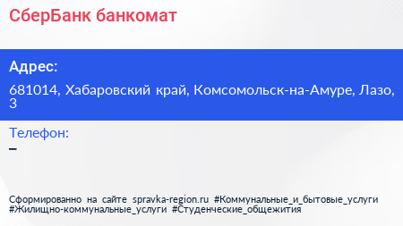 СберБанк, банкомат по адресу 681014, Хабаровский край, Комсомольск-на-Амуре, Лазо, 3 в дальнейшем Организация, размещена в следующих категориях: