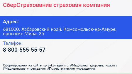СберСтрахование, страховая компания по адресу 681000, Хабаровский край, Комсомольск-на-Амуре, проспект Мира, 25 в дальнейшем Организация, размещена в следующих категориях:
