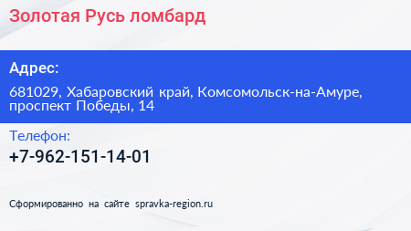 Золотая Русь, ломбард по адресу 681029, Хабаровский край, Комсомольск-на-Амуре, проспект Победы, 14 в дальнейшем Организация, размещена в следующих категориях: