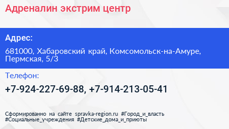 Адреналин, экстрим-центр по адресу 681000, Хабаровский край, Комсомольск-на-Амуре, Пермская, 5/3 в дальнейшем Организация, размещена в следующих категориях:
