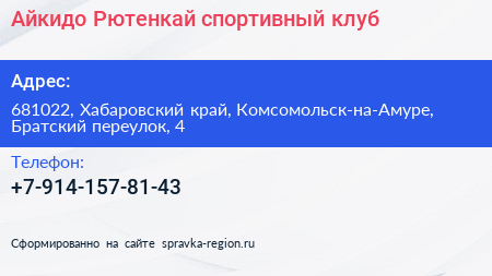 Айкидо Рютенкай, спортивный клуб по адресу 681022, Хабаровский край, Комсомольск-на-Амуре, Братский переулок, 4 в дальнейшем Организация, размещена в следующих категориях: