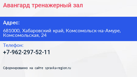 Авангард, тренажерный зал по адресу 681000, Хабаровский край, Комсомольск-на-Амуре, Комсомольская, 24 в дальнейшем Организация, размещена в следующих категориях: