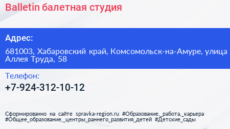 Balletin, балетная студия по адресу 681003, Хабаровский край, Комсомольск-на-Амуре, улица Аллея Труда, 58 в дальнейшем Организация, размещена в следующих категориях: