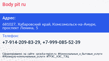 Body-pit.ru по адресу 681027, Хабаровский край, Комсомольск-на-Амуре, проспект Ленина, 5 в дальнейшем Организация, размещена в следующих категориях: