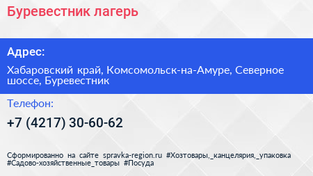 Буревестник, лагерь по адресу Хабаровский край, Комсомольск-на-Амуре, Северное шоссе, Буревестник в дальнейшем Организация, размещена в следующих категориях: