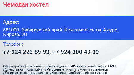 Чемодан, хостел по адресу 681000, Хабаровский край, Комсомольск-на-Амуре, Кирова, 20 в дальнейшем Организация, размещена в следующих категориях: