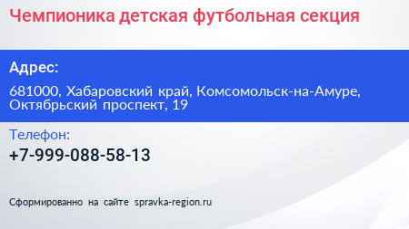 Чемпионика, детская футбольная секция по адресу 681000, Хабаровский край, Комсомольск-на-Амуре, Октябрьский проспект, 19 в дальнейшем Организация, размещена в следующих категориях: