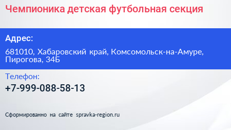 Чемпионика, детская футбольная секция по адресу 681010, Хабаровский край, Комсомольск-на-Амуре, Пирогова, 34Б в дальнейшем Организация, размещена в следующих категориях: