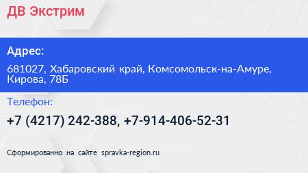 ДВ Экстрим по адресу 681027, Хабаровский край, Комсомольск-на-Амуре, Кирова, 78Б в дальнейшем Организация, размещена в следующих категориях:
