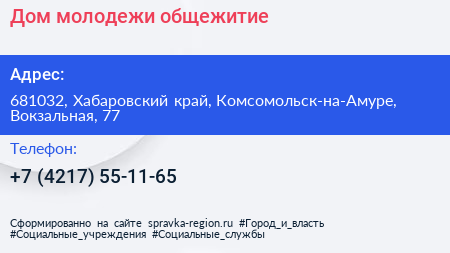 Дом молодежи, общежитие по адресу 681032, Хабаровский край, Комсомольск-на-Амуре, Вокзальная, 77 в дальнейшем Организация, размещена в следующих категориях: