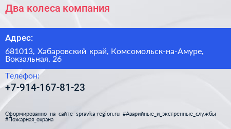Два колеса, компания по адресу 681013, Хабаровский край, Комсомольск-на-Амуре, Вокзальная, 26 в дальнейшем Организация, размещена в следующих категориях: