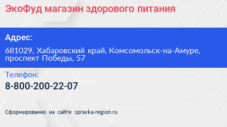 ЭкоФуд, магазин здорового питания по адресу 681029, Хабаровский край, Комсомольск-на-Амуре, проспект Победы, 57 в дальнейшем Организация, размещена в следующих категориях: