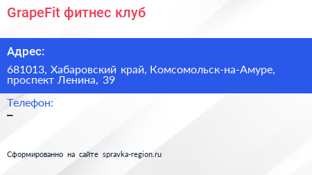 GrapeFit, фитнес-клуб по адресу 681013, Хабаровский край, Комсомольск-на-Амуре, проспект Ленина, 39 в дальнейшем Организация, размещена в следующих категориях: