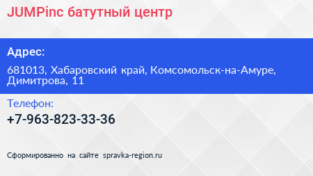 JUMPinc, батутный центр по адресу 681013, Хабаровский край, Комсомольск-на-Амуре, Димитрова, 11 в дальнейшем Организация, размещена в следующих категориях: