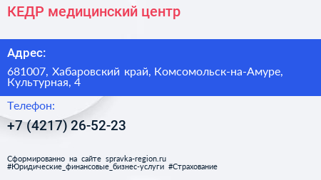 КЕДР, медицинский центр по адресу 681007, Хабаровский край, Комсомольск-на-Амуре, Культурная, 4 в дальнейшем Организация, размещена в следующих категориях: