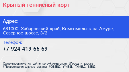 Крытый теннисный корт по адресу 681000, Хабаровский край, Комсомольск-на-Амуре, Северное шоссе, 3/2 в дальнейшем Организация, размещена в следующих категориях:
