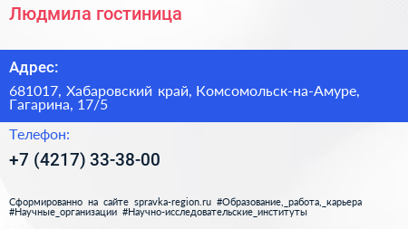 Людмила, гостиница по адресу 681017, Хабаровский край, Комсомольск-на-Амуре, Гагарина, 17/5 в дальнейшем Организация, размещена в следующих категориях: