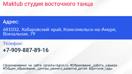 Maktub, студия восточного танца по адресу 681032, Хабаровский край, Комсомольск-на-Амуре, Вокзальная, 79 в дальнейшем Организация, размещена в следующих категориях:
