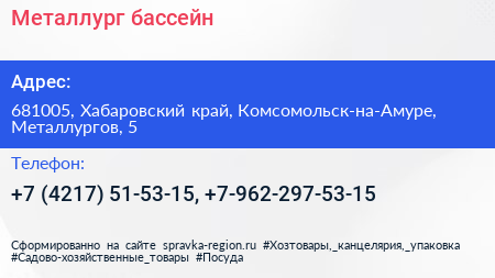 Металлург, бассейн по адресу 681005, Хабаровский край, Комсомольск-на-Амуре, Металлургов, 5 в дальнейшем Организация, размещена в следующих категориях: