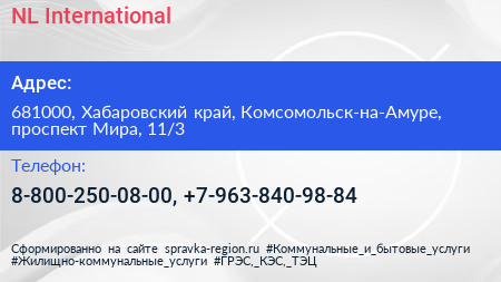 NL International по адресу 681000, Хабаровский край, Комсомольск-на-Амуре, проспект Мира, 11/3 в дальнейшем Организация, размещена в следующих категориях: