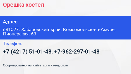 Орешка, хостел по адресу 681027, Хабаровский край, Комсомольск-на-Амуре, Пионерская, 63 в дальнейшем Организация, размещена в следующих категориях: