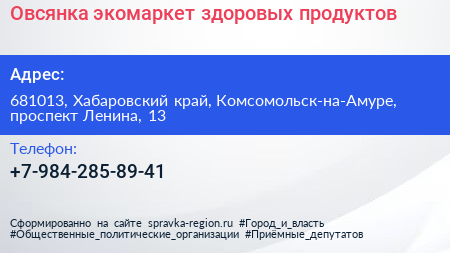 Овсянка, экомаркет здоровых продуктов по адресу 681013, Хабаровский край, Комсомольск-на-Амуре, проспект Ленина, 13 в дальнейшем Организация, размещена в следующих категориях: