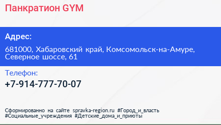 Панкратион GYM по адресу 681000, Хабаровский край, Комсомольск-на-Амуре, Северное шоссе, 61 в дальнейшем Организация, размещена в следующих категориях: