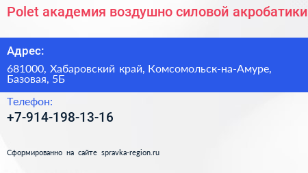 Polet, академия воздушно-силовой акробатики по адресу 681000, Хабаровский край, Комсомольск-на-Амуре, Базовая, 5Б в дальнейшем Организация, размещена в следующих категориях: