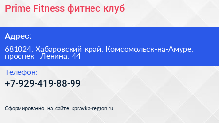 Prime Fitness, фитнес-клуб по адресу 681024, Хабаровский край, Комсомольск-на-Амуре, проспект Ленина, 44 в дальнейшем Организация, размещена в следующих категориях:
