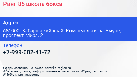 Ринг-85, школа бокса по адресу 681000, Хабаровский край, Комсомольск-на-Амуре, проспект Мира, 2 в дальнейшем Организация, размещена в следующих категориях: