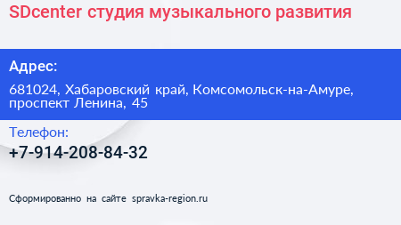 SDcenter, студия музыкального развития по адресу 681024, Хабаровский край, Комсомольск-на-Амуре, проспект Ленина, 45 в дальнейшем Организация, размещена в следующих категориях: