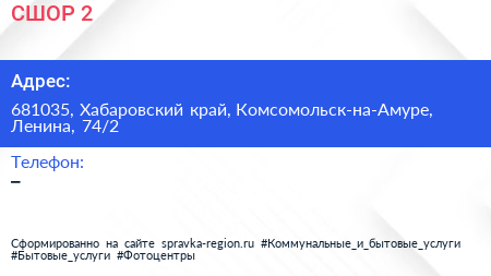 СШОР №2 по адресу 681035, Хабаровский край, Комсомольск-на-Амуре, Ленина, 74/2 в дальнейшем Организация, размещена в следующих категориях: