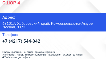 СШОР №4 по адресу 681017, Хабаровский край, Комсомольск-на-Амуре, Лесная, 11/2 в дальнейшем Организация, размещена в следующих категориях: