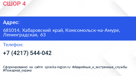 СШОР №4 по адресу 681014, Хабаровский край, Комсомольск-на-Амуре, Ленинградская, 63 в дальнейшем Организация, размещена в следующих категориях: