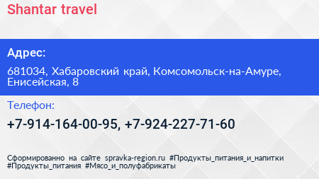 Shantar-travel по адресу 681034, Хабаровский край, Комсомольск-на-Амуре, Енисейская, 8 в дальнейшем Организация, размещена в следующих категориях: