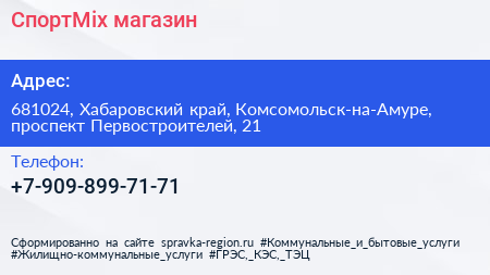 СпортMix, магазин по адресу 681024, Хабаровский край, Комсомольск-на-Амуре, проспект Первостроителей, 21 в дальнейшем Организация, размещена в следующих категориях: