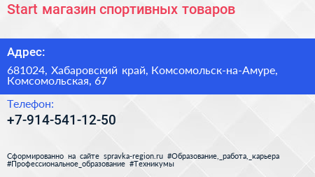 Start, магазин спортивных товаров по адресу 681024, Хабаровский край, Комсомольск-на-Амуре, Комсомольская, 67 в дальнейшем Организация, размещена в следующих категориях: