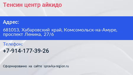 Тенсин, центр айкидо по адресу 681013, Хабаровский край, Комсомольск-на-Амуре, проспект Ленина, 27/6 в дальнейшем Организация, размещена в следующих категориях: