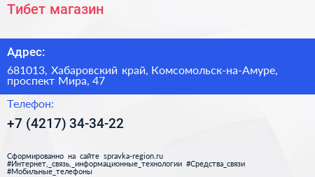 Тибет, магазин по адресу 681013, Хабаровский край, Комсомольск-на-Амуре, проспект Мира, 47 в дальнейшем Организация, размещена в следующих категориях: