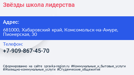 Звёзды, школа лидерства по адресу 681000, Хабаровский край, Комсомольск-на-Амуре, Пионерская, 30 в дальнейшем Организация, размещена в следующих категориях:
