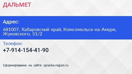 ДАЛЬМЕТ по адресу 681007, Хабаровский край, Комсомольск-на-Амуре, Жуковского, 51/2 в дальнейшем Организация, размещена в следующих категориях: