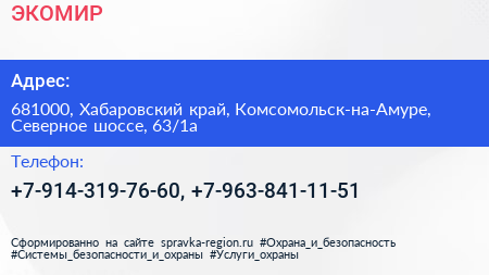 ЭКОМИР по адресу 681000, Хабаровский край, Комсомольск-на-Амуре, Северное шоссе, 63/1а в дальнейшем Организация, размещена в следующих категориях: