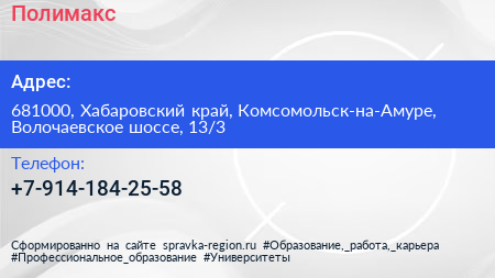 Полимакс по адресу 681000, Хабаровский край, Комсомольск-на-Амуре, Волочаевское шоссе, 13/3 в дальнейшем Организация, размещена в следующих категориях: