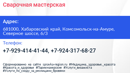 Сварочная мастерская по адресу 681000, Хабаровский край, Комсомольск-на-Амуре, Северное шоссе, 6/3 в дальнейшем Организация, размещена в следующих категориях: