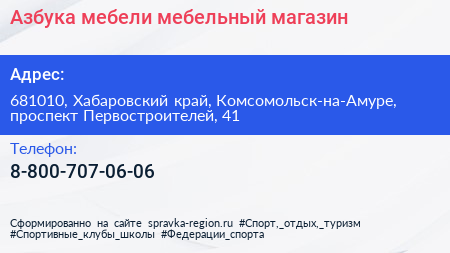 Азбука мебели, мебельный магазин по адресу 681010, Хабаровский край, Комсомольск-на-Амуре, проспект Первостроителей, 41 в дальнейшем Организация, размещена в следующих категориях:
