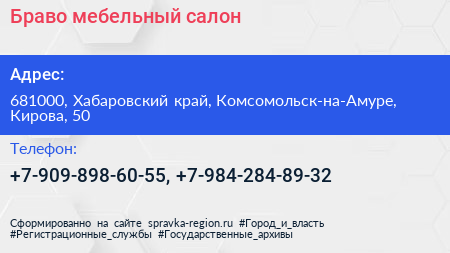 Браво, мебельный салон по адресу 681000, Хабаровский край, Комсомольск-на-Амуре, Кирова, 50 в дальнейшем Организация, размещена в следующих категориях:
