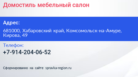 Домостиль, мебельный салон по адресу 681000, Хабаровский край, Комсомольск-на-Амуре, Кирова, 49 в дальнейшем Организация, размещена в следующих категориях:
