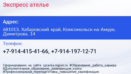 Экспресс-ателье по адресу 681013, Хабаровский край, Комсомольск-на-Амуре, Димитрова, 14 в дальнейшем Организация, размещена в следующих категориях: