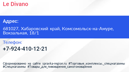 Le Divano по адресу 681027, Хабаровский край, Комсомольск-на-Амуре, Вокзальная, 18/1 в дальнейшем Организация, размещена в следующих категориях:
